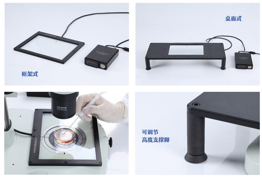 本產(chǎn)品有兩種產(chǎn)品結(jié)構(gòu)??蚣苁郊軜?gòu),直接放置于體視顯微鏡載物平臺(tái)上;桌面式結(jié)構(gòu),帶有四個(gè)可調(diào)節(jié)高度支撐腳,適配所有型號(hào)體式顯微鏡。